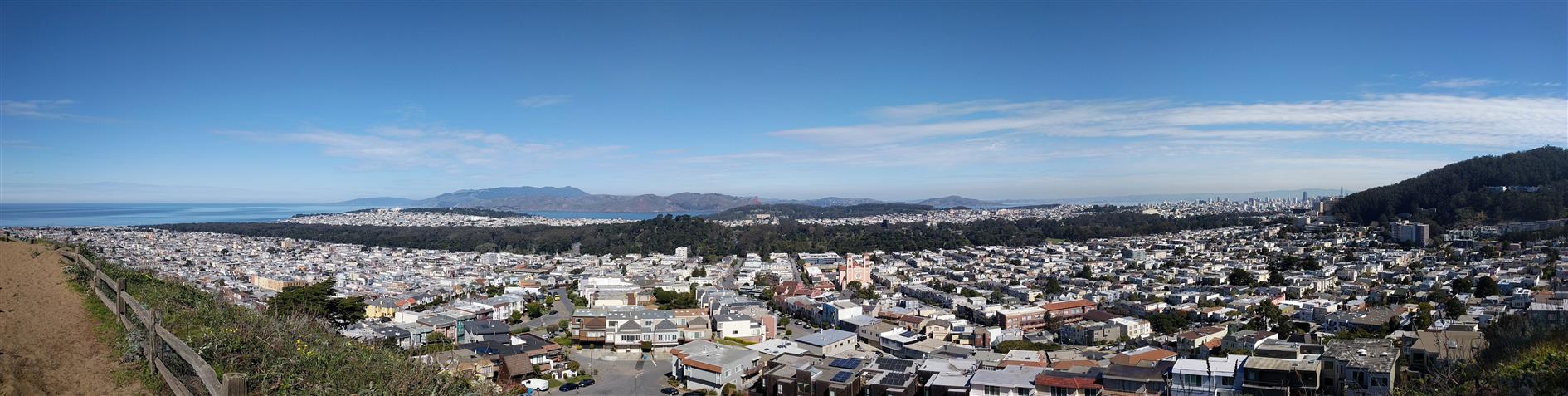 South from Golden Gate Heights Park, Sutro Tower from Twin Peaks, south from Golden Gate Heights again with more clouds and west from Grand View Park. Photo is a panorama of Golden Gate Park from Grand View.
