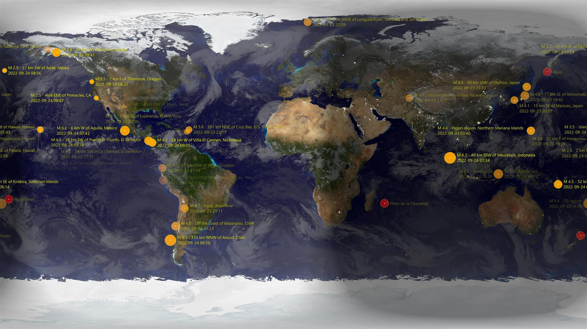 The final theme, earthquakes, uses a different daytime map with a more geological look and adds earthquakes for the past 24 hours. Size is proportional to magnitude and the quakes fade out over 24 hours so the most recent are highly visible. Again it's possible to customize extensively via layers. You can show active volcanoes and control the colors used, transparency and which magnitudes to plot. The video below shows a month of earthquakes as seen in Catfood Earth: