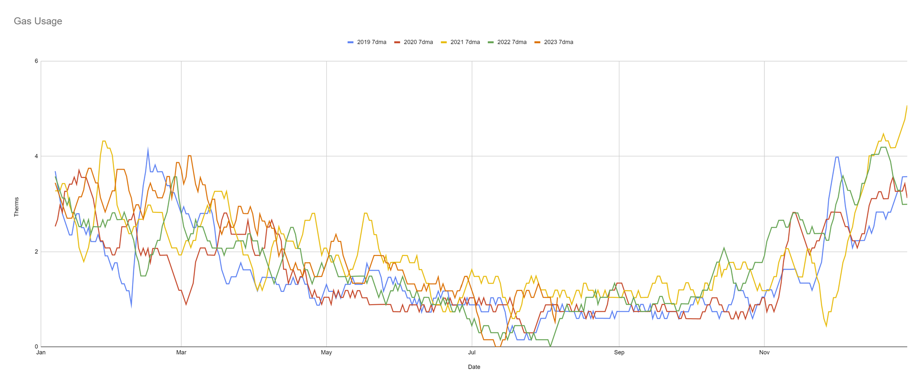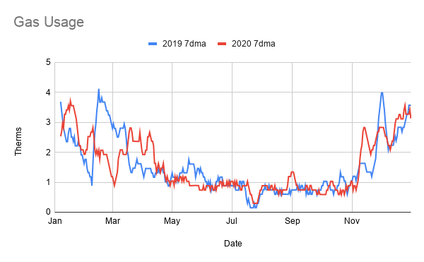 Took a while to update, but here is some more data. Electricity stayed high until Spring 2021 and then dropped to roughly pre-pandemic levels. This is because I spent a lot of time in 2021 upgrading lighting. My house has a different type of fixture/bulb in every room making this a painful process but I'm almost 100% LED at this point which has made a difference. Gas on the other hand has got higher and stayed there and I should really replace some more windows and add some more insulation...