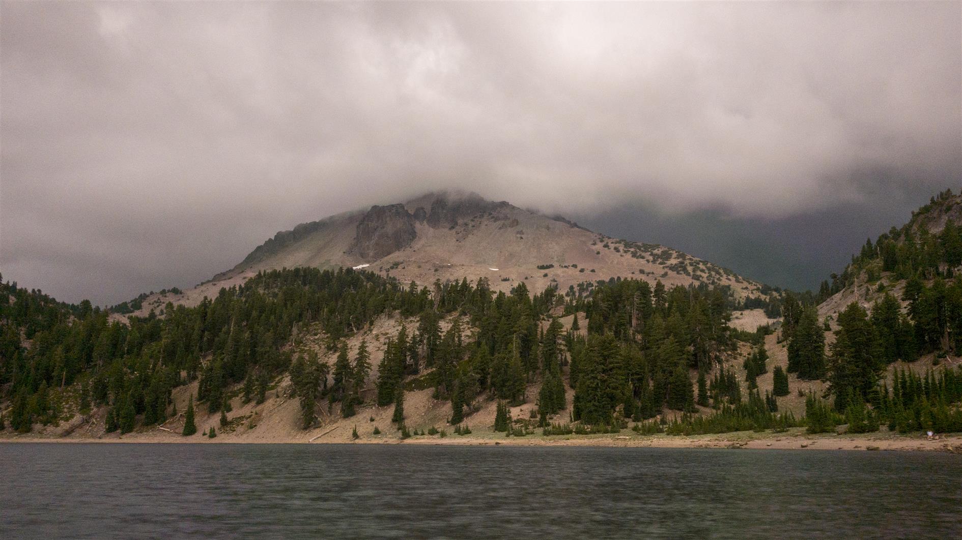 A storm builds over Lassen Peak. Filmed from Lake Helen in Lassen Volcanic National Park.