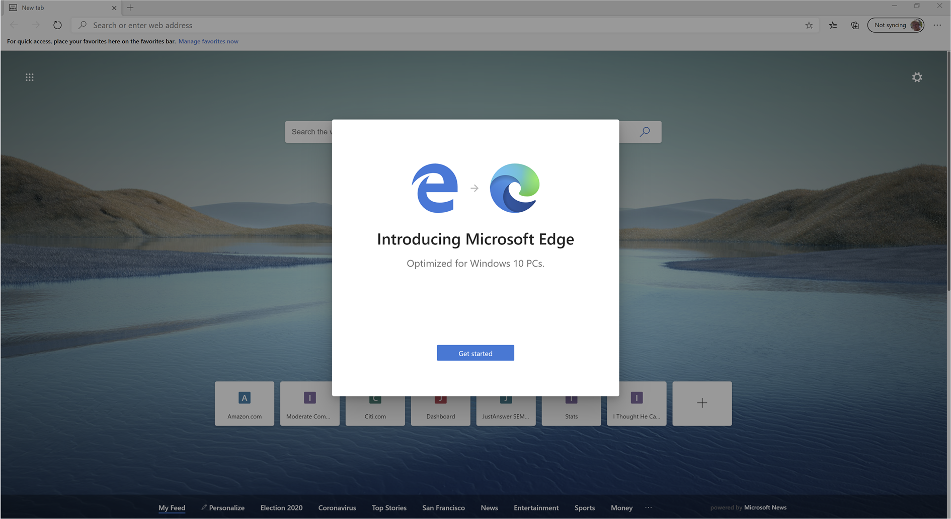 So I'm confused, Microsoft. Do you want me to use Edge? After installing updates Edge wants to 'Get started', on a nice modal with no cancel button or even any little x to close it. Must be some mistake right, not quite ready for prime time if they forgot the 'Don't get started' button. Maybe I'll try it when the kinks are worked out.