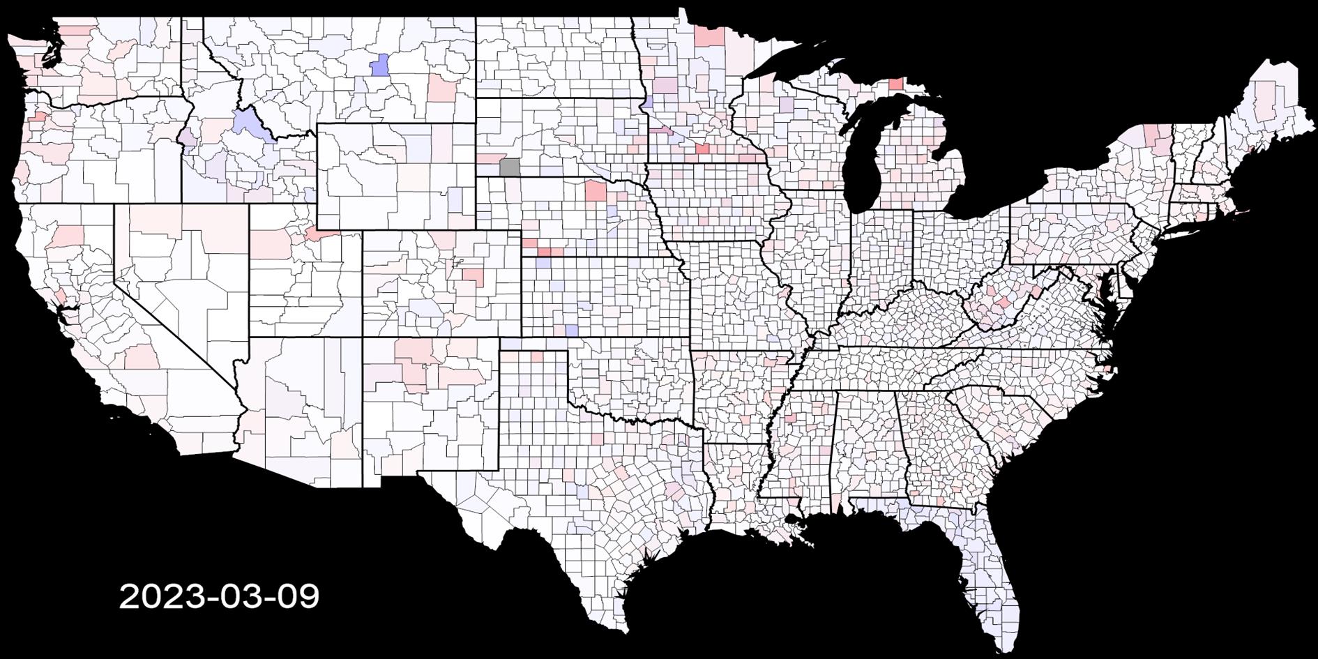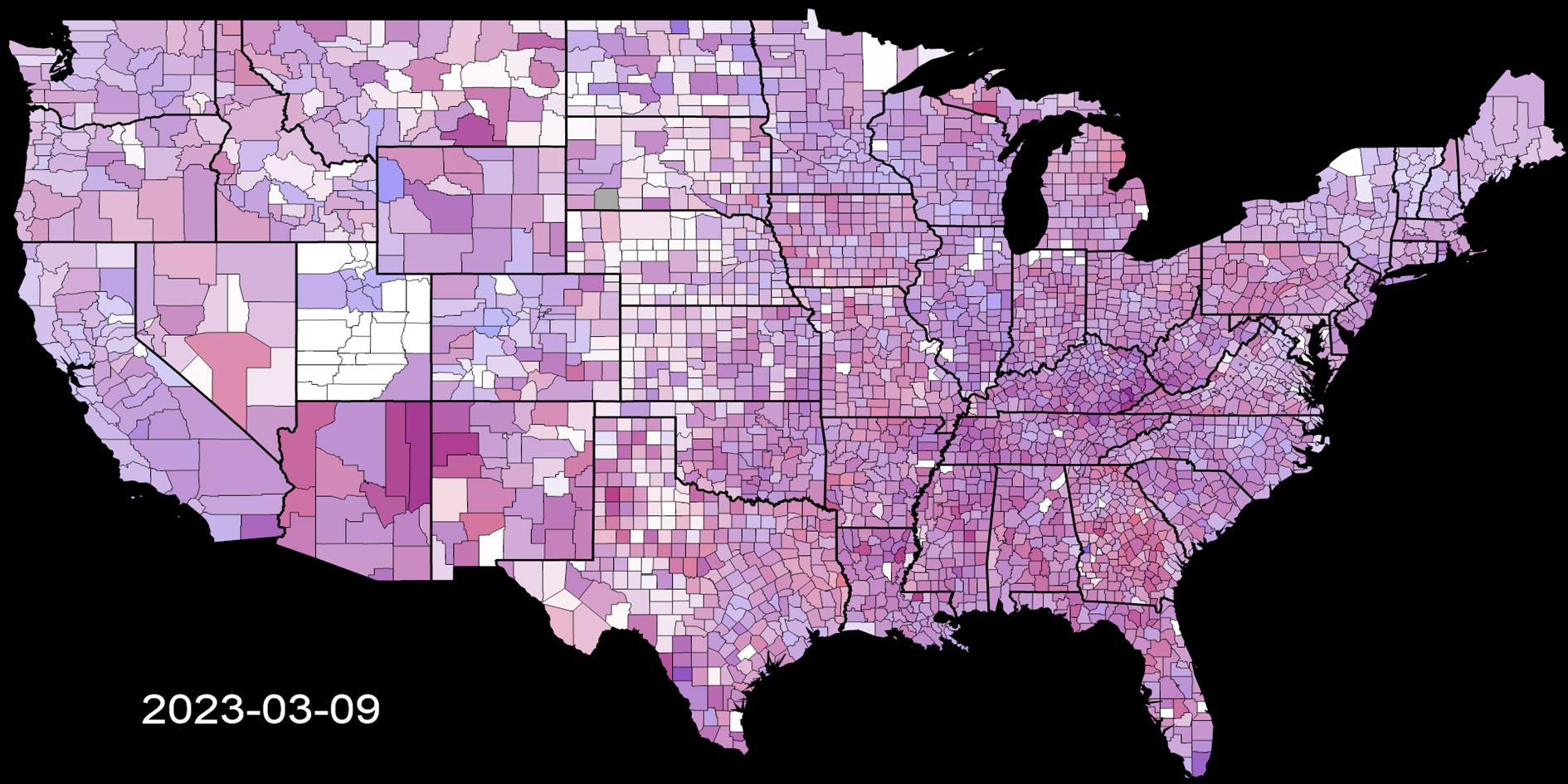 brightest shade of red. This shows where COVID-19 is relatively bad over time.