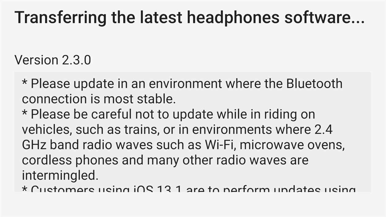It looks like I need to travel to the United States National Radio Quiet Zone in West Virginia to update the firmware in my headphones, and I don't think that's on the cards for several months so I hope the update isn't important.