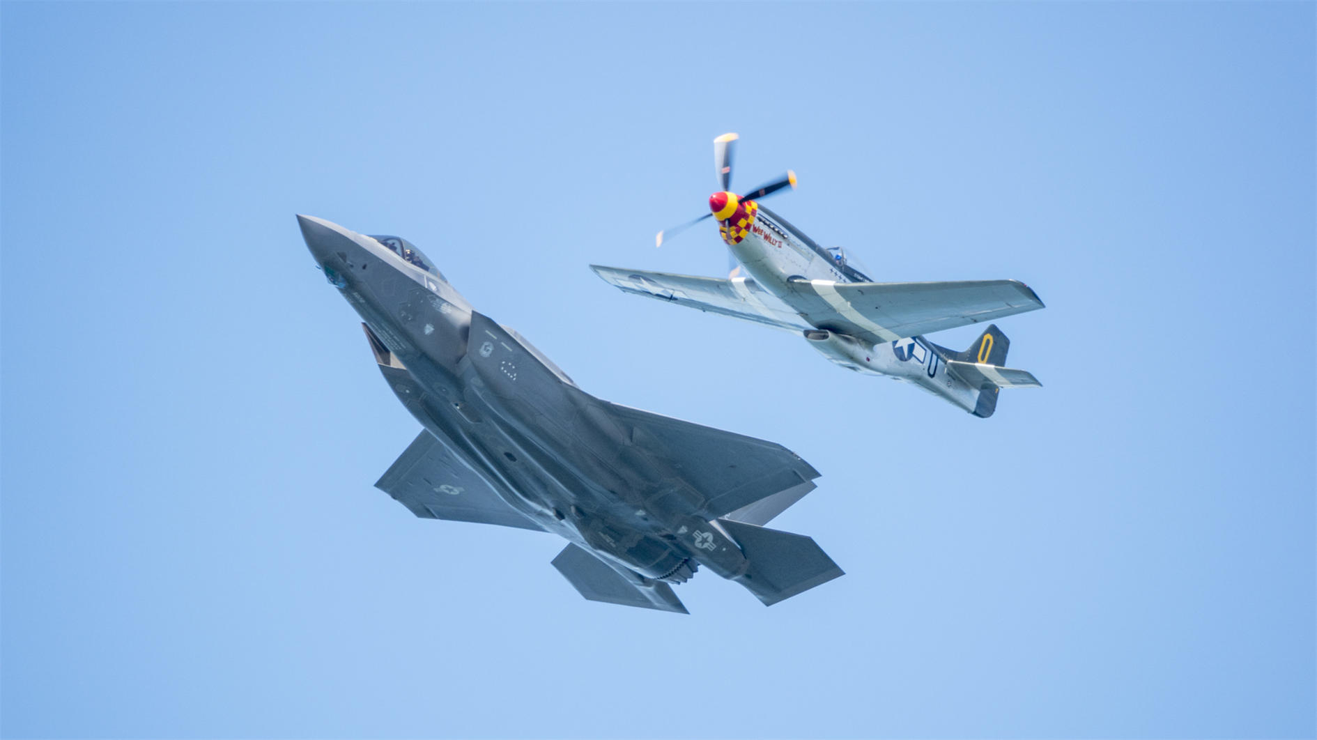 Blue Angels, United 777, a Patriot passing Treasure Island and an F-35 wtih a P-51.
