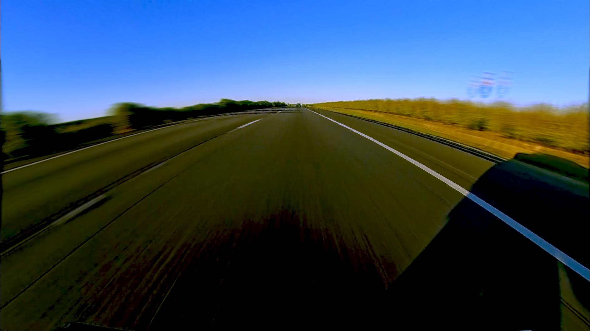Today I wrestled with the problem a bit more deeply and got something working. The image at the top of this post is a drive cam frame that is dramatically improved. The trick is using the lenscorrection filter in ffmpeg. The filter requires k1 and k2 coefficients which I solved for by generating hundreds of videos and eyeballing them, like the horrifying experience of visiting an optician and suspecting that they're going to write your prescription based on your opinion of which letter looks better. After much juggling I settled on -0.45 and 0.11. In terms of command line this translates to: